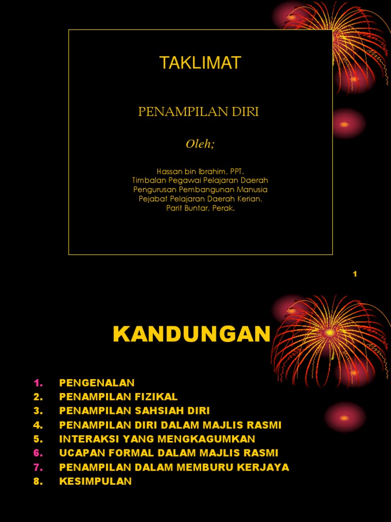 PENAMPILAN DIRI Tampil Datang atau Melangkah Memajukan Mengemukakan Menampilkan Mengemukakan Memajukan seseorang atau sesuatu Penampilan Perihal Tindakan Usaha mengemukakan seseorang atau sesuatu WWWJENDELAILMUSOLUTIONSCOM Terampil. Jika pertemuan pertama tidak berkesan anda mungkin tida peluang kedua. MAKSUD TATAHIAS Satu aspek pengurusan diri yang menitikberatkan tentang kekemasan kesempurnaan dan kesesuaian berpakaian dalam penampilan diri semasa urusan rasmi atau di majlis.